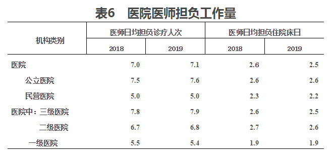 £¨¶þ£©Ò½ÔºÒ½Ê¦ÊÂÇ鸺ºÉ¡£2019Ä꣬ҽԺҽʦÈÕ¾ùµ£¸ºÕïÁÆ7.1È˴κÍסԺ2.5´²ÈÕ£¬ÆäÖУº¹«Á¢Ò½ÔºÒ½Ê¦ÈÕ¾ùµ£¸ºÕïÁÆ7.6È˴κÍסԺ2.6´²ÈÕ£¨¼û±í6£©¡£