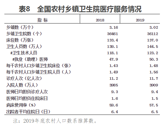 2019Äêµ×£¬ÌìÏÂ3.02Íò¸öÖÝÀï¹²Éè3.6Íò¸öÖÝÀïÎÀÉúÔº£¬´²Î»137.0ÍòÕÅ£¬ÎÀÉúÖ°Ô±144.5ÍòÈË£¨ÆäÖÐÎÀÍâÐÐÒÕÖ°Ô±123.2ÍòÈË£©¡£ÓëÉÏÄê½ÏÁ¿£¬ÖÝÀïÎÀÉúÔºïÔÌ349¸ö£¨ÖÝÀï³·²¢ºóÎÀÉúÔººÏ²¢£©£¬´²Î»ÔöÌí3.6ÍòÕÅ£¬Ö°Ô±ÔöÌí5.4ÍòÈË¡£2019Ä꣬ÿǧũ´åÉú³ÝÖÝÀïÎÀÉúÔº´²Î»´ï1.48ÕÅ£¬Ã¿Ç§Å©´åÉú³ÝÖÝÀïÎÀÉúÔºÖ°Ô±´ï1.56ÈË£¨¼û±í8£©¡£
