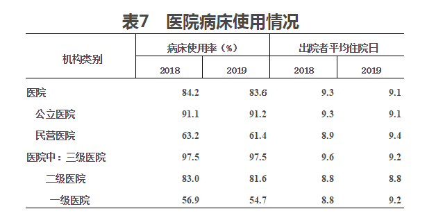 £¨Èý£©²¡´²Ê¹Óá£2019Ä꣬ÌìÏÂÒ½Ôº²¡´²Ê¹ÓÃÂÊ83.6£¥£¬ÆäÖУº¹«Á¢Ò½Ôº91.2%¡£ÓëÉÏÄê½ÏÁ¿£¬Ò½Ôº²¡´²Ê¹ÓÃÂÊϽµ0.6¸ö°Ù·Öµã£¨ÆäÖй«Á¢Ò½ÔºÉÏÉý0.1¸ö°Ù·Öµã£©¡£2019ÄêÒ½Ôº³öÔºÕ߯½¾ùסԺÈÕΪ9.1ÈÕ£¨ÆäÖУº¹«Á¢Ò½Ôº9.1ÈÕ£©£¬Ò½Ôº³öÔºÕ߯½¾ùסԺÈÕ±ÈÉÏÄêÂÔÓÐϽµ£¨¼û±í7£©¡£