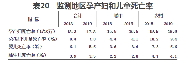 £¨¶þ£©5ËêÒÔ϶ùͯéæÃüÂÊ¡£¾Ý¸¾Ó×ÎÀÉú¼à²â£¬2019Ä꣬5ËêÒÔ϶ùͯéæÃüÂÊ7.8¡ë£¬ÆäÖУº¶¼»á4.1¡ë£¬Å©´å9.4¡ë£»Ó¤¶ùéæÃüÂÊ5.6¡ë£¬ÆäÖУº¶¼»á3.4¡ë£¬Å©´å6.6¡ë¡£ÓëÉÏÄêÏà±È£¬5ËêÒÔ϶ùͯéæÃüÂÊ¡¢Ó¤¶ùéæÃüÂʾùÓвî±ðˮƽµÄϽµ£¨¼û±í20£©¡£