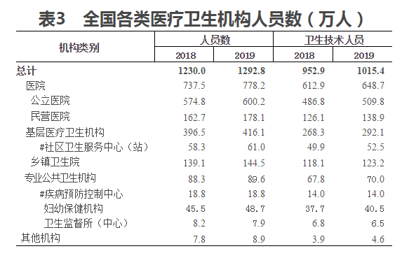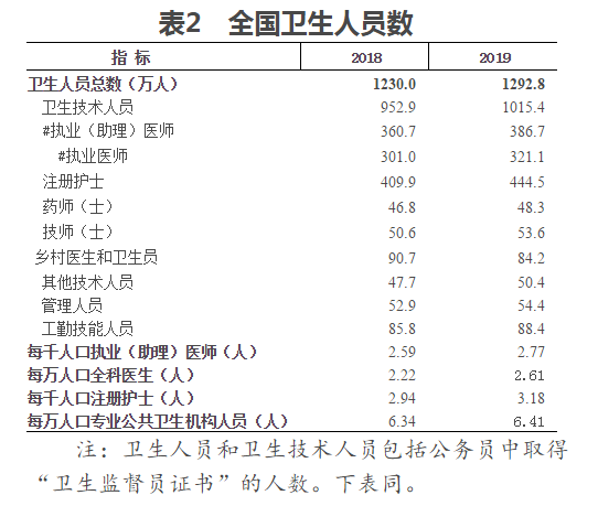 £¨Èý£©ÎÀÉúÖ°Ô±×ÜÊý¡£2019Äê⣬ÌìÏÂÎÀÉúÖ°Ô±×ÜÊý´ï1292.8ÍòÈË£¬±ÈÉÏÄêÔöÌí62.8ÍòÈË£¨ÔöÌí5.1%£©¡£