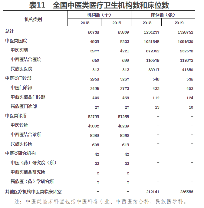£¨Ò»£©ÖÐÒ½Àà»ú¹¹¡¢´²Î»¼°Ö°Ô±Êý¡£2019Äê⣬ÌìÏÂÖÐÒ½ÀàÒ½ÁÆÎÀÉúÆø¹¹×ÜÊý´ï65809¸ö£¬±ÈÉÏÄêÔöÌí5071¸ö¡£ÆäÖУºÖÐÒ½ÀàÒ½Ôº5232¸ö£¬ÖÐÒ½ÀàÃÅÕﲿ¡¢ÕïËù60535¸ö£¬ÖÐÒ½ÀàÑо¿»ú¹¹42¸ö¡£ÓëÉÏÄê½ÏÁ¿£¬ÖÐÒ½ÀàÒ½ÔºÔöÌí293¸ö£¬ÖÐÒ½ÀàÃÅÕﲿ¼°ÕïËùÔöÌí4778¸ö£¨¼û±í11£©¡£