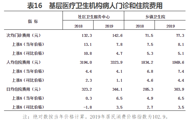 £¨¶þ£©Ï²ãÒ½ÁÆÎÀÉúÆø¹¹²¡ÈËÒ½Ò©Óöȡ£2019Ä꣬ÉçÇøÎÀÉúЧÀÍÖÐÐĴξùÃÅÕïÓöÈ142.6Ôª£¬°´Îôʱ¼ÛÇ®±ÈÉÏÄêÉÏÕÇ7.8%£¬°´¿É±È¼ÛÇ®ÉÏÕÇ4.7%£»È˾ùסԺÓöÈ3323.9Ôª£¬°´Îôʱ¼ÛÇ®±ÈÉÏÄêÉÏÕÇ4.1%£¬°´¿É±È¼ÛÇ®ÉÏÕÇ1.1%£¨¼û±í16£©¡£