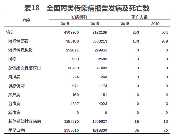 2019Ä꣬ÌìϱûÀàѬȾ²¡³ýË¿³æ²¡ÎÞ·¢²¡ºÍéæÃü²¡Àý±¨¸æÍ⣬ÆäÓà10ÖÖ¹²±¨¸æ·¢²¡717.2ÍòÀý£¬éæÃü304ÈË¡£±¨¸æ·¢²¡Êý¾Óǰ5λµÄ²¡ÖÖÒÀ´ÎΪʢÐÐÐÔÉË·ç¡¢ÊÖ×ã¿Ú²¡¡¢ÆäËûѬȾÐÔ¸¹Ðº²¡¡¢Ê¢ÐÐÐÔÈùÏÙÑ׺ͼ±ÐÔ³öѪÐÔ½áĤÑ×£¬Õ¼±ûÀàѬȾ²¡±¨¸æ·¢²¡×ÜÊýµÄ99.5%¡£±¨¸æéæÃüÊý½Ï¶àµÄ²¡ÖÖÒÀ´ÎΪʢÐÐÐÔÉË·ç¡¢ÊÖ×ã¿Ú²¡ºÍÆäËûѬȾÐÔ¸¹Ðº²¡£¬Õ¼±ûÀàѬȾ²¡±¨¸æéæÃü×ÜÊýµÄ99.3£¥£¨¼û±í18£©¡£