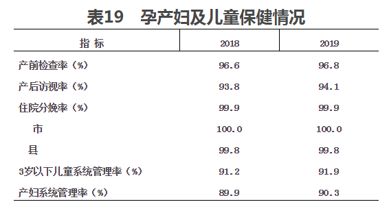 £¨Ò»£©¸¾Ó×±£½¡¡£2019Ä꣬Ôвú¸¾²úǰ¼ì²éÂÊ96.8%£¬²úºó·ÃÊÓÂÊ94.1%¡£ÓëÉÏÄê½ÏÁ¿£¬²úǰ¼ì²éÂʺͲúºó·ÃÊÓÂʾùÓÐÌá¸ß£¨¼û±í19£©¡£2019ÄêסԺÁÙÅèÂÊΪ99.9%£¨ÊÐ100.0%£¬ÏØ99.8%£©£¬ÓëÉÏÄê³Öƽ¡£