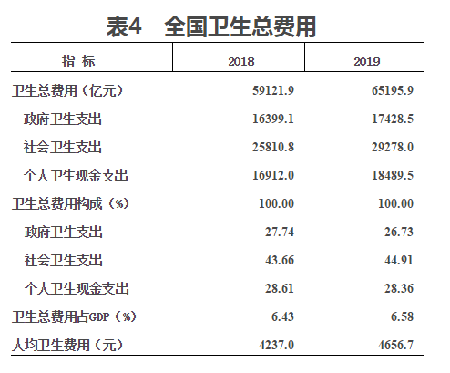 £¨ËÄ£©ÎÀÉú×ÜÓöȡ£2019ÄêÌìÏÂÎÀÉú×ÜÓöÈÔ¤¼Æ´ï65195.9ÒÚÔª£¬ÆäÖУºÕþ¸®ÎÀÉúÖ§³ö17428.5ÒÚÔª£¨Õ¼26.7%£©£¬Éç»áÎÀÉúÖ§³ö29278.0ÒÚÔª£¨Õ¼44.9%£©£¬Ð¡ÎÒ˽¼ÒÎÀÉúÖ§³ö18489.5ÒÚÔª£¨Õ¼28.4%£©¡£È˾ùÎÀÉú×ÜÓöÈ4656.7Ôª£¬ÎÀÉú×ÜÓöÈÕ¼GDP°Ù·Ö±ÈΪ6.6%£¨¼û±í4£©¡£