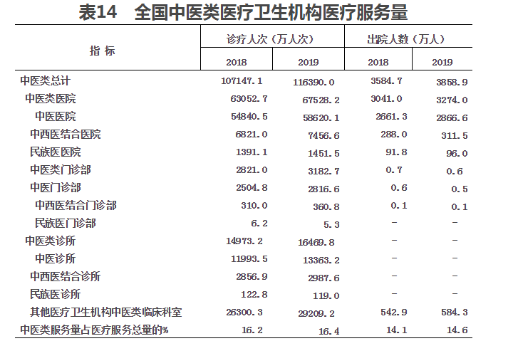 £¨¶þ£©ÖÐÒ½Ò½ÁÆÐ§ÀÍ¡£2019Ä꣬ÌìÏÂÖÐÒ½ÀàÒ½ÁÆÎÀÉúÆø¹¹×ÜÕïÁÆÈ˴δï11.6ÒÚÈ˴Σ¬±ÈÉÏÄêÔöÌí0.9ÒÚÈ˴Σ¨ÔöÌí8.6%£©¡£ÆäÖУºÖÐÒ½ÀàÒ½Ôº6.8ÒÚÈ˴Σ¨Õ¼58.0%£©£¬ÖÐÒ½ÀàÃÅÕﲿ¼°ÕïËù2.0ÒÚÈ˴Σ¨Õ¼16.9%£©£¬ÆäËûÒ½ÁÆ»ú¹¹ÖÐÒ½ÀàÁÙ´²¿ÆÊÒ2.9ÒÚÈ˴Σ¨Õ¼25.1%£©¡£