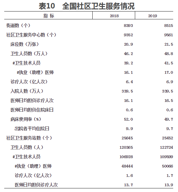 2019Ä꣬ÌìÏÂÉçÇøÎÀÉúЧÀÍÖÐÐÄÕïÁÆÈË´Î6.9ÒÚÈ˴Σ¬ÈëÔºÈËÊý339.5ÍòÈË£»Æ½¾ùÿÆäÖÐÐÄÄêÕïÁÆÁ¿7.2ÍòÈ˴Σ¬ÄêÈëÔºÁ¿355ÈË£»Ò½Ê¦ÈÕ¾ùµ£¸ºÕïÁÆ16.5È˴κÍסԺ0.6´²ÈÕ¡£2019Ä꣬ÌìÏÂÉçÇøÎÀÉúЧÀÍÕ¾ÕïÁÆÈË´Î1.7ÒÚÈ˴Σ¬Æ½¾ùÿվÄêÕïÁÆÁ¿6603È˴Σ¬Ò½Ê¦ÈÕ¾ùµ£¸ºÕïÁÆ13.9È˴Σ¨¼û±í10£©¡£