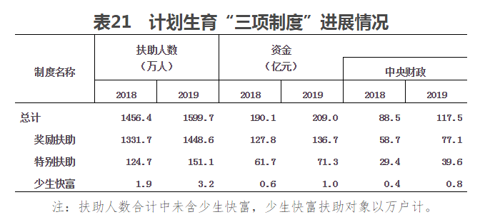£¨¶þ£©ÍýÏëÉúÓý¼ÒÍ¥½±ÀøºÍ°ïÖúÕþ²ß¡£2019ÄêÍýÏëÉúÓý¼ÒÍ¥½±ÀøºÍ°ïÖú¡°ÈýÏîÖÆ¶È¡±¹²Í¶Èë×ʽð209ÒÚÔª£¬±ÈÉÏÄêÔöÌí18.9ÒÚÔª£»Å©´å²¿·ÖÍýÏëÉúÓý¼ÒÍ¥½±Àø°ïÖúÖÆ¶ÈÊÜÒæ1448.6ÍòÈË£»ÍýÏëÉúÓý¼ÒÍ¥ÌØÊâ°ïÖúÖÆ¶ÈÊÜÒæ151.1ÍòÈË£¬Î÷²¿µØÇø¡°ÉÙÉú¿ì¸»¡±¹¤³ÌÊÜÒæ3.2Íò»§¡£