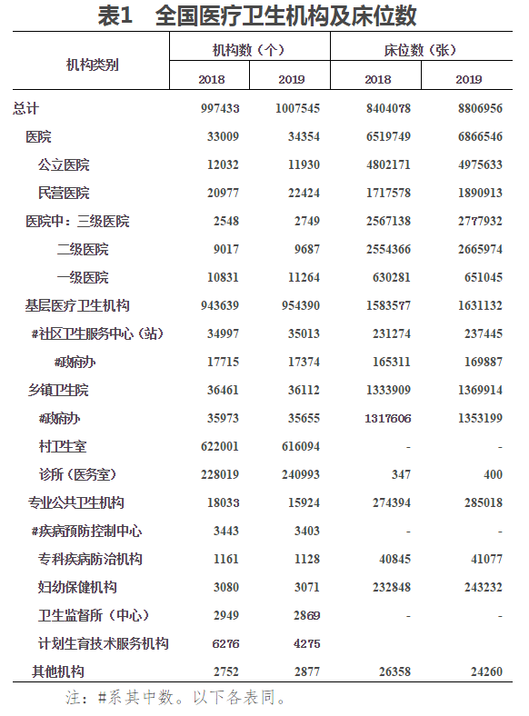 £¨Ò»£©Ò½ÁÆÎÀÉúÆø¹¹×ÜÊý¡£2019Äê⣬ÌìÏÂÒ½ÁÆÎÀÉúÆø¹¹×ÜÊý´ï1007545¸ö£¬±ÈÉÏÄêÔöÌí10112¸ö¡£ÆäÖУºÒ½Ôº34354¸ö£¬Ï²ãÒ½ÁÆÎÀÉúÆø¹¹954390¸ö£¬×¨Òµ¹«¹²ÎÀÉúÆø¹¹15924¸ö¡£ÓëÉÏÄêÏà±È£¬Ò½ÔºÔöÌí1345¸ö£¬Ï²ãÒ½ÁÆÎÀÉúÆø¹¹ÔöÌí10751¸ö£¨¼û±í1£©¡£