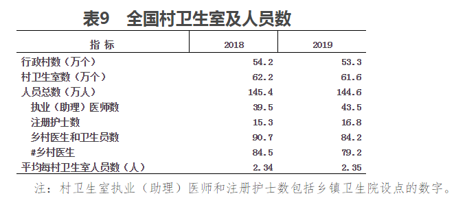 2019Äêµ×£¬ÌìÏÂ53.3Íò¸öÐÐÕþ´å¹²Éè61.6Íò¸ö´åÎÀÉúÊÒ¡£´åÎÀÉúÊÒÖ°Ô±´ï144.6ÍòÈË£¬ÆäÖУºÖ´Òµ£¨ÖúÀí£©Ò½Ê¦43.5ÍòÈË¡¢×¢²á»¤Ê¿16.8ÍòÈË¡¢ÐæÂäÒ½ÉúºÍÎÀÉúÔ±84.2ÍòÈË¡£Æ½¾ùÿ´åÎÀÉúÊÒÖ°Ô±2.35ÈË¡£ÓëÉÏÄê½ÏÁ¿£¬´åÎÀÉúÊÒÊýïÔÌ0.6Íò¸ö£¬Ö°Ô±×ÜÊýÓÐËùïÔÌ£¨¼û±í9£©¡£