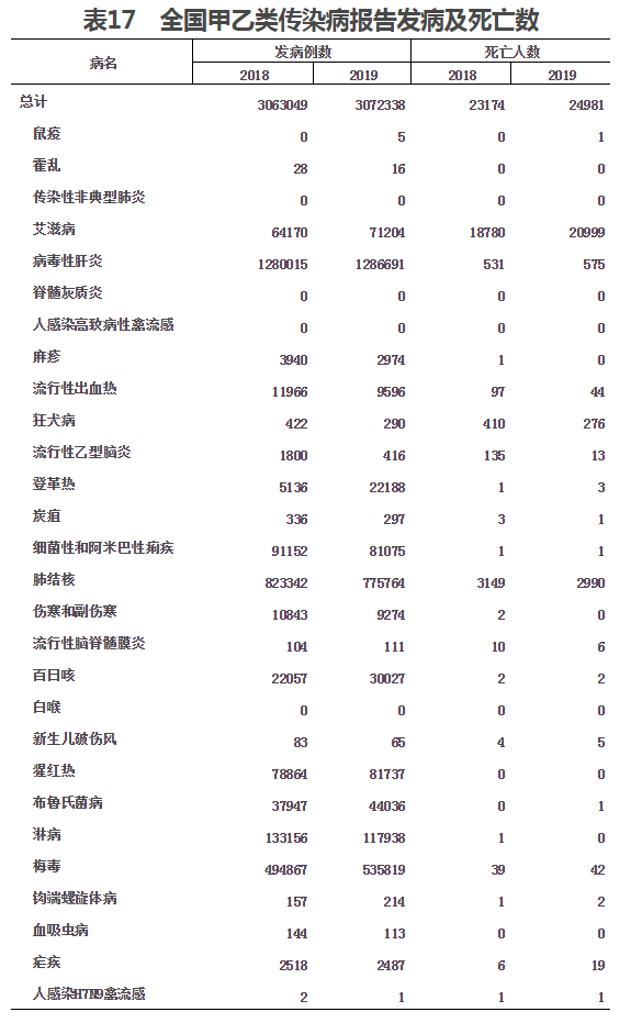 £¨Ò»£©Ñ¬È¾²¡±¨¸æ·¢²¡ºÍéæÃü¡£2019Ä꣬Ììϼס¢ÒÒÀàѬȾ²¡±¨¸æ·¢²¡307.2ÍòÀý£¬±¨¸æéæÃü24981ÈË¡£±¨¸æ·¢²¡Êý¾Óǰ5λµÄÊDz¡¶¾ÐÔ¸ÎÑס¢·Î½áºË¡¢Ã·¶¾¡¢Áܲ¡ºÍÐɺìÈÈ£¬Õ¼¼×ÒÒÀàѬȾ²¡±¨¸æ·¢²¡×ÜÊýµÄ91.1%¡£±¨¸æéæÃüÊý¾ÓǰÎåλµÄÊǰ¬×̲¡¡¢·Î½áºË¡¢²¡¶¾ÐÔ¸ÎÑס¢¿ñÈ®²¡ºÍÊ¢ÐÐÐÔ³öѪÈÈ£¬Õ¼¼×ÒÒÀàѬȾ²¡±¨¸æéæÃü×ÜÊýµÄ99.6%£¨¼û±í17£©¡£