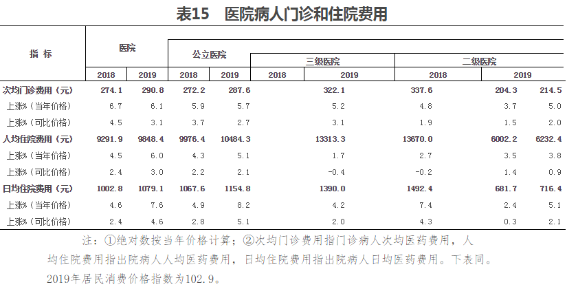 £¨Ò»£©Ò½Ôº²¡ÈËÒ½Ò©Óöȡ£2019Ä꣬ҽԺ´Î¾ùÃÅÕïÓöÈ290.8Ôª£¬°´Îôʱ¼ÛÇ®±ÈÉÏÄêÉÏÕÇ6.1%£¬°´¿É±È¼ÛÇ®ÉÏÕÇ3.1%£»È˾ùסԺÓöÈ9848.4Ôª£¬°´Îôʱ¼ÛÇ®±ÈÉÏÄêÉÏÕÇ6.0%£¬°´¿É±È¼ÛÇ®ÉÏÕÇ3.0%¡£ÈÕ¾ùסԺÓöÈ1079.1Ôª£¨¼û±í15£©¡£