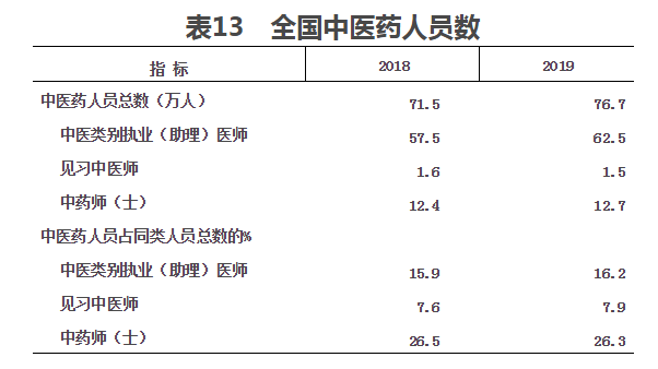 2019Äê⣬ÌìÏÂÖÐÒ½Ò©ÎÀÉúÖ°Ô±×ÜÊý´ï76.7ÍòÈË£¬±ÈÉÏÄêÔöÌí5.2ÍòÈË£¨ÔöÌí7.2%£©¡£ÆäÖУºÖÐÒ½ÖÖ±ðÖ´Òµ£¨ÖúÀí£©Ò½Ê¦62.5ÍòÈË£¬ÖÐҩʦ£¨Ê¿£©12.7ÍòÈË¡£Á½ÀàÖ°Ô±½ÏÉÏÄê¾ùÓÐËùÔöÌí£¨¼û±í13£©¡£