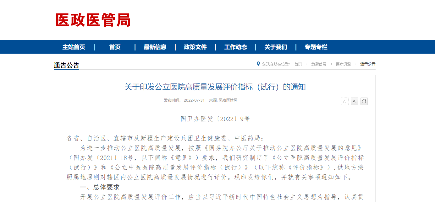 Î§ÈÆ×Å¡¶¹«Á¢Ò½Ôº¸ßÖÊÁ¿Éú³¤µÄÒâ¼û¡·ÒªÇó £¬½ñÄê7Ô £¬¹ú¼ÒÎÀ½¡Î¯Ðû²¼ÁË¡¶¹«Á¢Ò½Ôº¸ßÖÊÁ¿Éú³¤ÆÀ¼ÛÖ¸±ê£¨ÊÔÐУ©¡· £¬´Óר¿ÆÄÜÁ¦¡¢Ò½ÁÆÖÊÁ¿¡¢Ò½ÁÆÐ§ÂÊµÈÆ«Ïò £¬ÎªÒ½ÔºÖÜÈ«Âäʵ¸ßÖÊÁ¿Éú³¤Ìá³ö½¹µãÒªÇó¡£