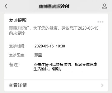 Ò½Éú¿ÉÔÚÃÅÕïÖÎÀíϵͳÖÐ×ÔÐб༭¸´Õïʱ¼äºÍÌáÐÑÄÚÈÝ¡£Ð½¨¸´ÕïÌáÐѺó£¬ÐÅÏ¢»áͬ²½µ½¿Í·þ´¦£¬ÏµÍ³»á×Ô¶¯ÌáǰһÌìͨ¹ý΢ÐÅ»òÕß¶ÌÐÅÌáÐÑ»¼ÕßǰÀ´¸´Õï¡£×èÖ¹Òòʱ¼ä¿ç¶È³¤¡¢»¼ÕßÒÅÍüµÈÒòËØÓ°Ï츴ÕïÂÊ¡£