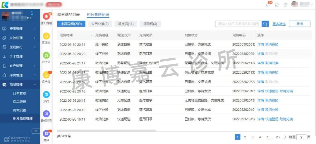 UG环球云诊所还提供专有页面协助诊所治理积分产品订单,诊所客服可以通过兑换纪录审查兑换时间、兑换商品名称、配送方法及兑换状态。如客户选择的是实物商品,可支持快递或到店自提效劳;如客户选择兑换医疗效劳、优惠券或赠予金,则可以到店核销或线上使用。