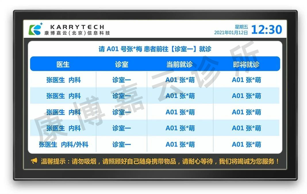 另外,云诊所治理系统最近还升级了叫号效劳功效,在诊室门口,也有小屏可以展示目今诊室的医生信息和患者排队情形。