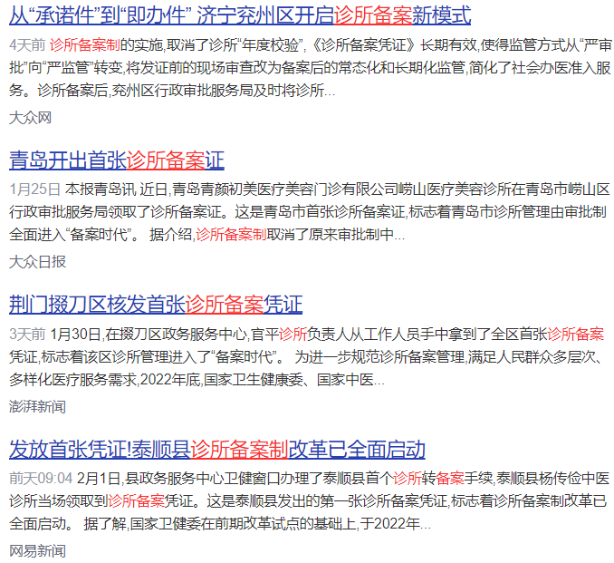 2019年到2022年时代,卫健委在北京、上海、南京、沈阳、武汉、成都、杭州、广州、深圳、西安等10个都会完成了诊所备案试点事情,2022年底《诊所备案治理暂行步伐》正式落地了 。2023年,天下各地会正式最先推行《诊所备案制》,只要准备好相关资料当天就能获得诊所备案的凭证!