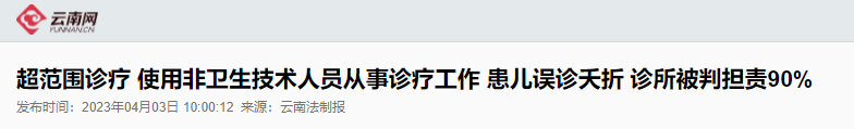 ½üÆÚ£¬ÔÆÄÏÍøÐû²¼ÁËһƪ±¨µÀ£¬Ò»¼ÒÕïËùÓÉÓÚÈ÷ÇÎÀÍâÐÐÒÕÖ°Ô±¾ÙÐÐÕïÁÆ£¬µ¼ÖÂÒ»¶ùͯزÕÛ¡£ÕïËù±»Åиº90%µÄÔðÈΣ¬¹²¼ÆÅâ³¥90¶àÍòÔª¡£